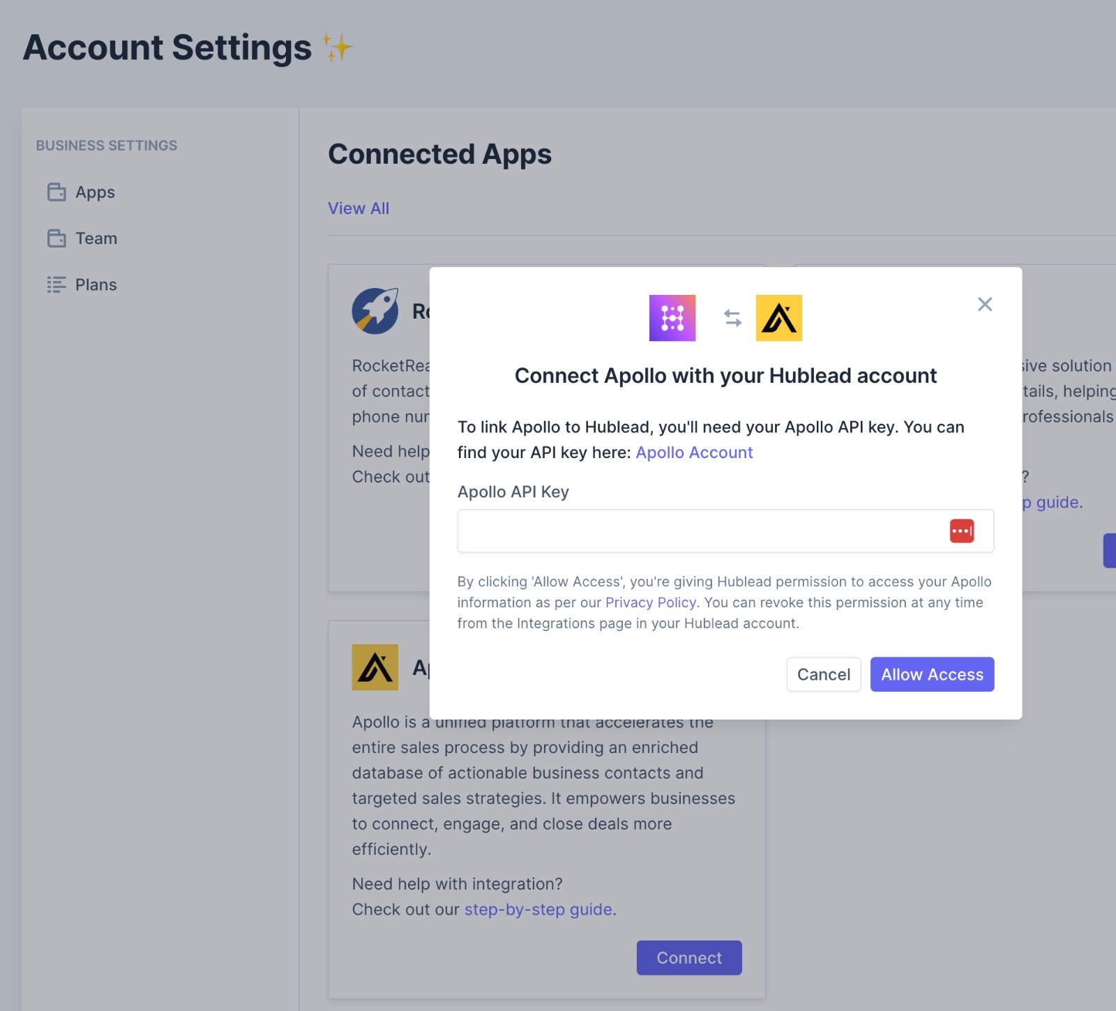 - You need to create an account on Rocket Reach if you do not have one. You can select two types of subcriptions: emails only or emails & phone numbers, both work with Hublead it just depends of your needs.